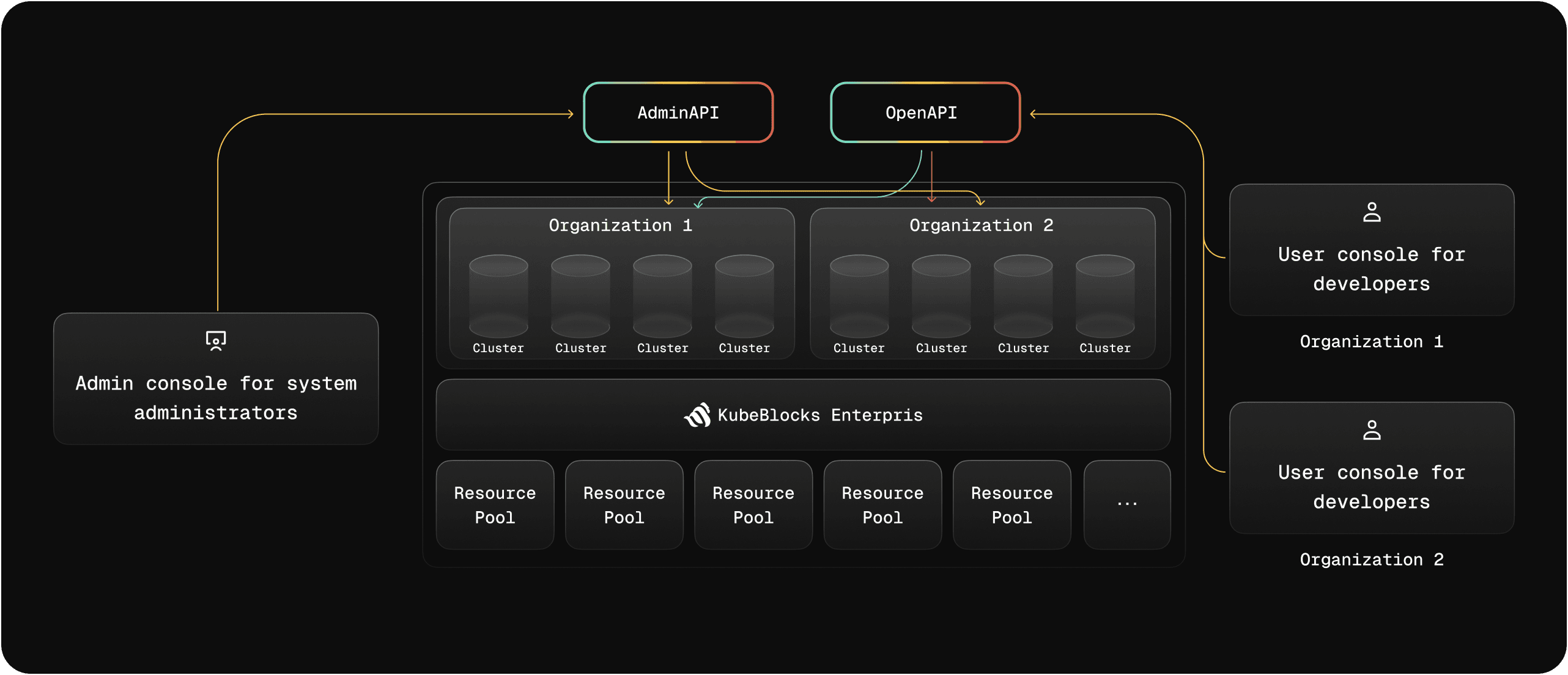 KubeBlocks Enterprise enforces a clear separation between User and Admin access boundaries. Application Developer teams and Platform Engineer teams interact with the system through different network paths and distinct control endpoints. User Console endpoints are exposed in user-accessible environments for day-to-day cluster operations, while Admin Console endpoints reside in secured office or management networks with stricter access controls. This boundary isolation significantly reduces the attack surface and operational risk, strengthening the platform’s overall security and governance.